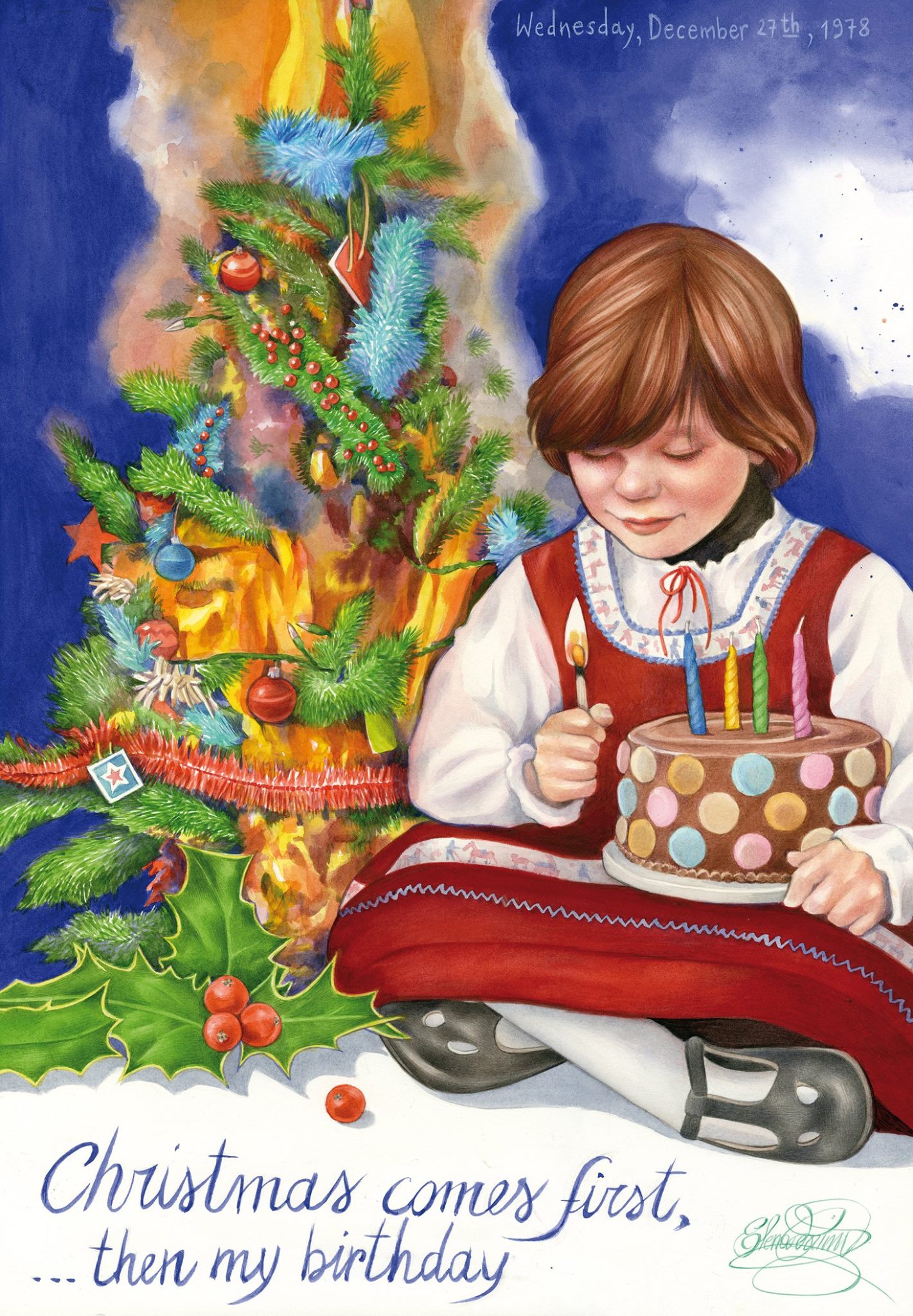 Quest’illustrazione di Elena Terrin, nella quale si ritrae a 4 anni con la torta e le candeline davanti all’albero di Natale, realizzata per una Mostra organizzata dalla Fondazione Fossati e promossa a Monza da Luigi Bona, è emblematica: essa la ritrae da piccola al suo 4° compleanno (nel fondo blu vi è scritto a destra in alto: “Wednesday, December 27 th, 1978”), quando commentò «My Way of Xmas» (“Il mio modo di vivere il Natale”), visti i litigi che spesso accadevano in famiglia, “sola” innanzi alla luce della candelina e di sfondo l’albero coi festosi addobbi natalizi; l’illustrazione è in realtà intitolata: Christmas comes first, …then my birthday (Prima viene il Natale, …poi il mio compleanno), un modo affettuoso per indicare nel Natale un evento più grande e sentito a cui segue il compleanno in un’atmosfera di festività natalizia prolungata e gioiosa.